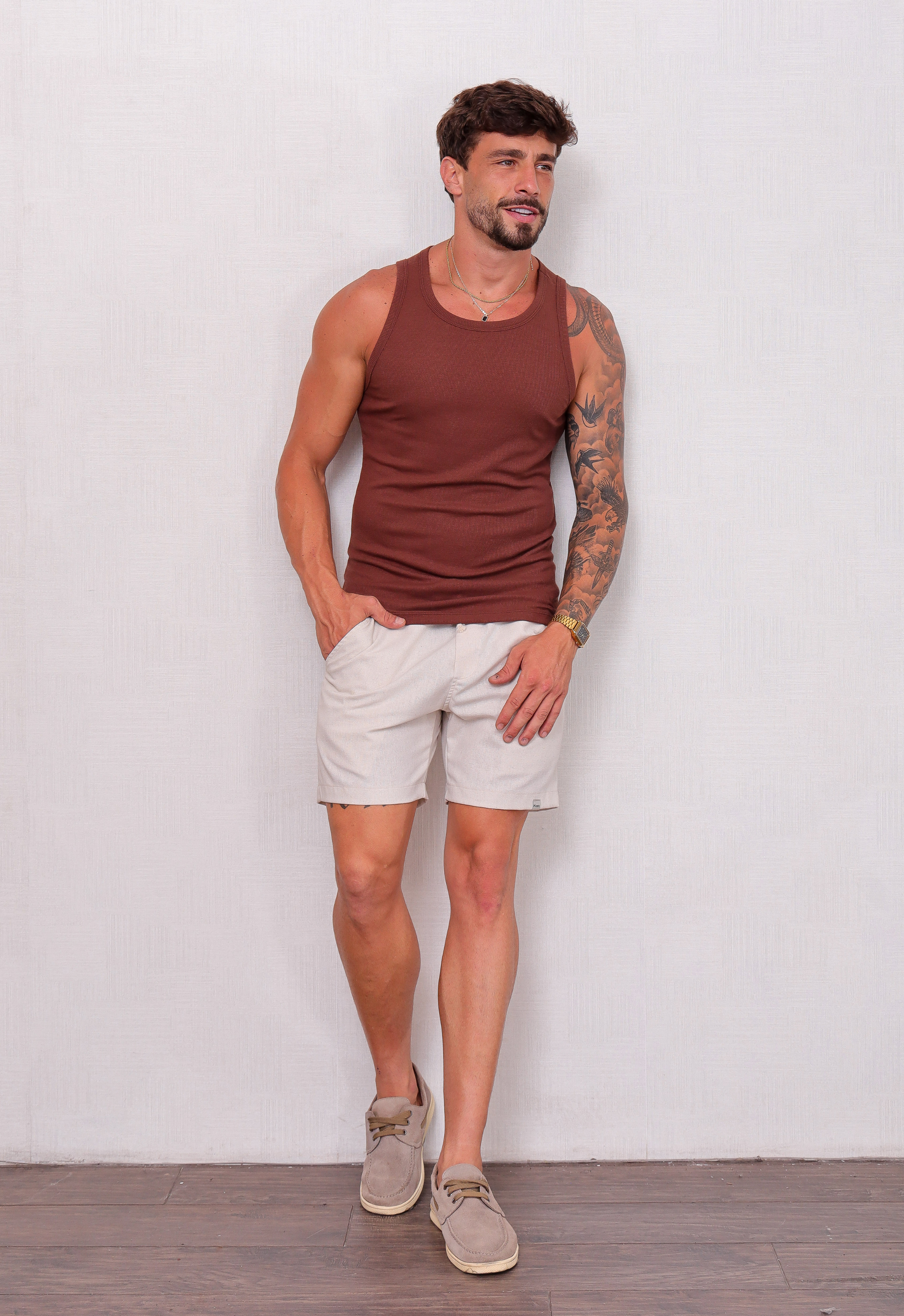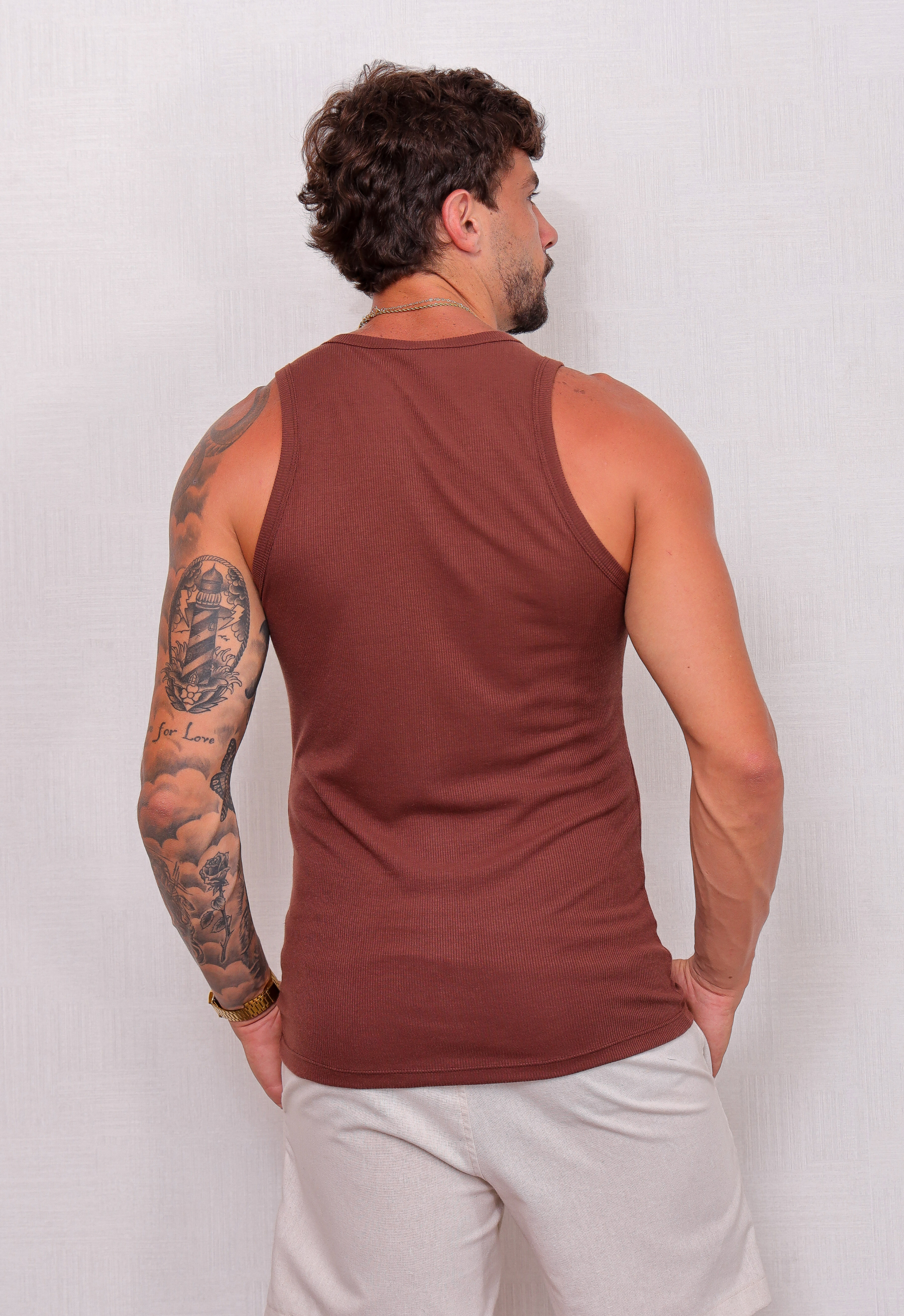 Com um design moderno e ajustado, a Camiseta Regata Americana Masculina é a escolha ideal para quem busca estilo e conforto em uma peça só. A modelagem slim fit valoriza a silhueta, proporcionando um visual mais definido e elegante, sem abrir mão da liberdade de movimento. Confeccionada em tecido canelado, é perfeita para compor um look casual e estiloso.